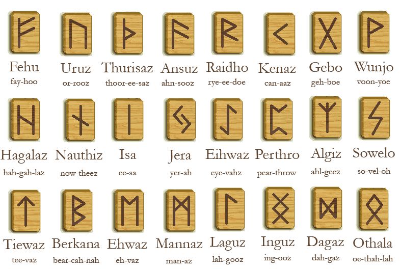 - Wunjo: Gioia, illuminazione, preghiera, grazia. Fortuna, salute, ricchezza e felicità possono scaturire da diverse fonti.